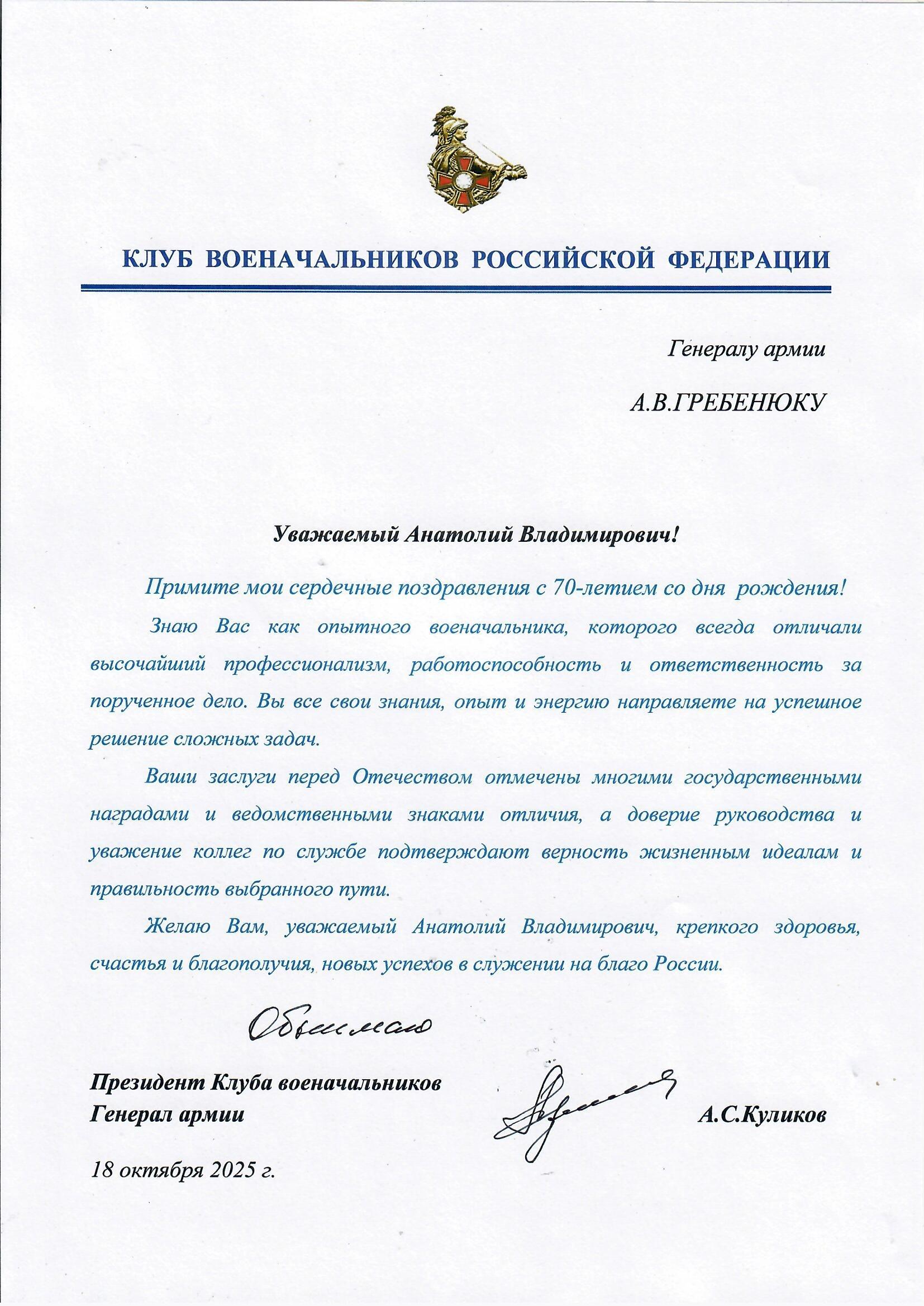 18 октября 70-летний юбилей отмечает генерал армии Анатолий Владимирович Гребенюк.