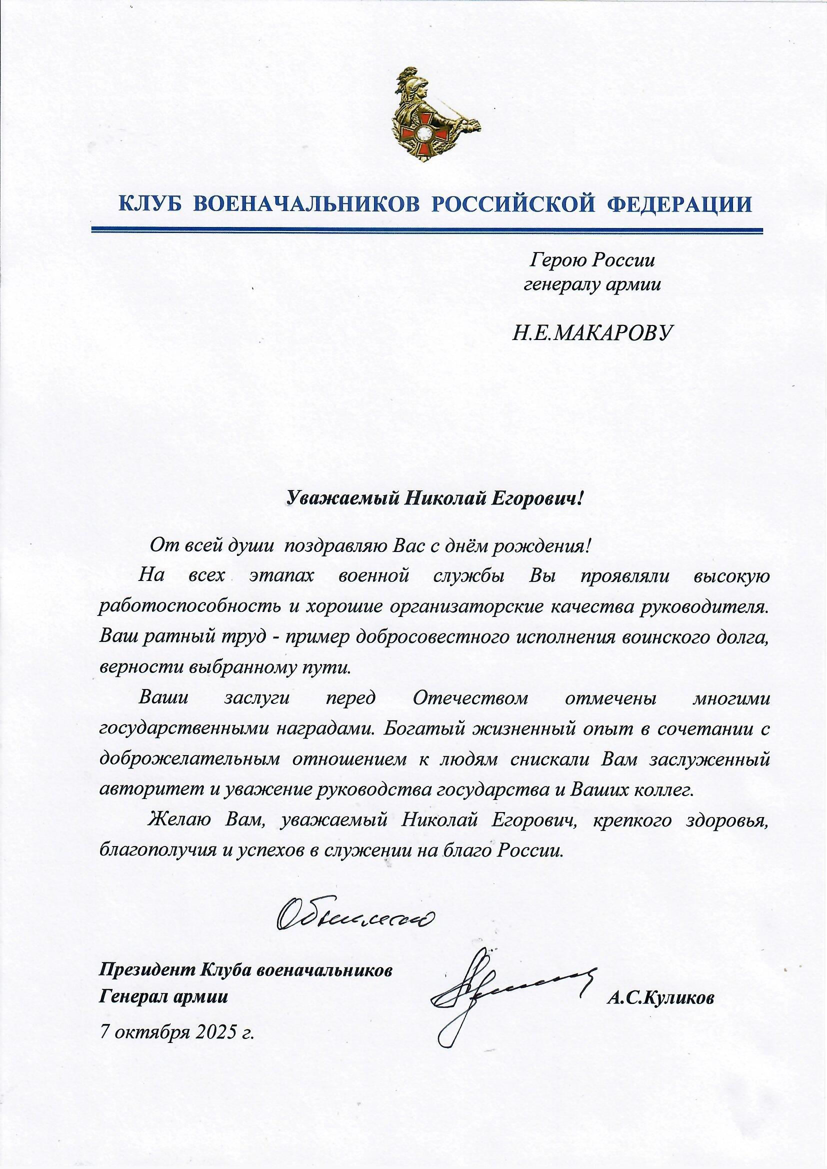 Поздравление юбиляру от имени Клуба военачальников Российской Федерации направил Президент Клуба генерал армии А. С. Куликов.