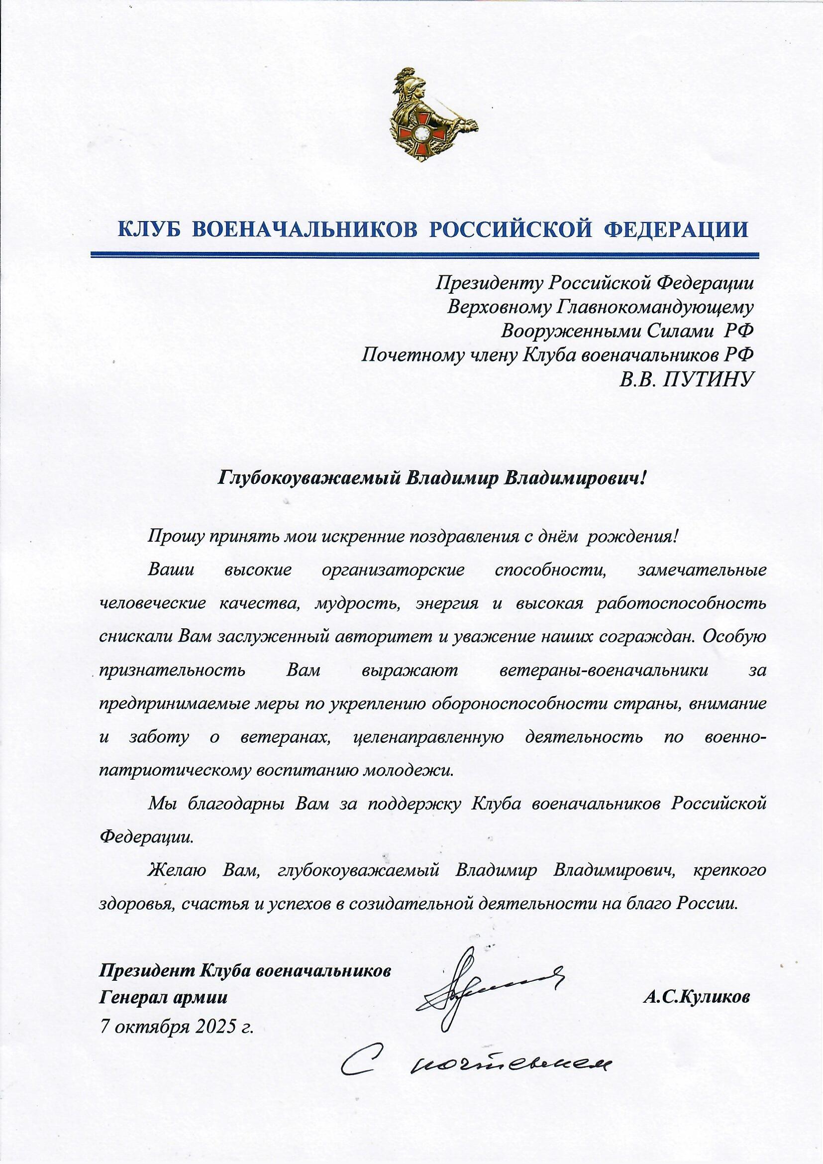 Президенту Российской Федерации Верховному Главнокомандующему Вооруженными Силами РФ Почетному члену Клуба военачальников РФ В.В. Путину ТЕМЫ:поздравления 07.10.2025