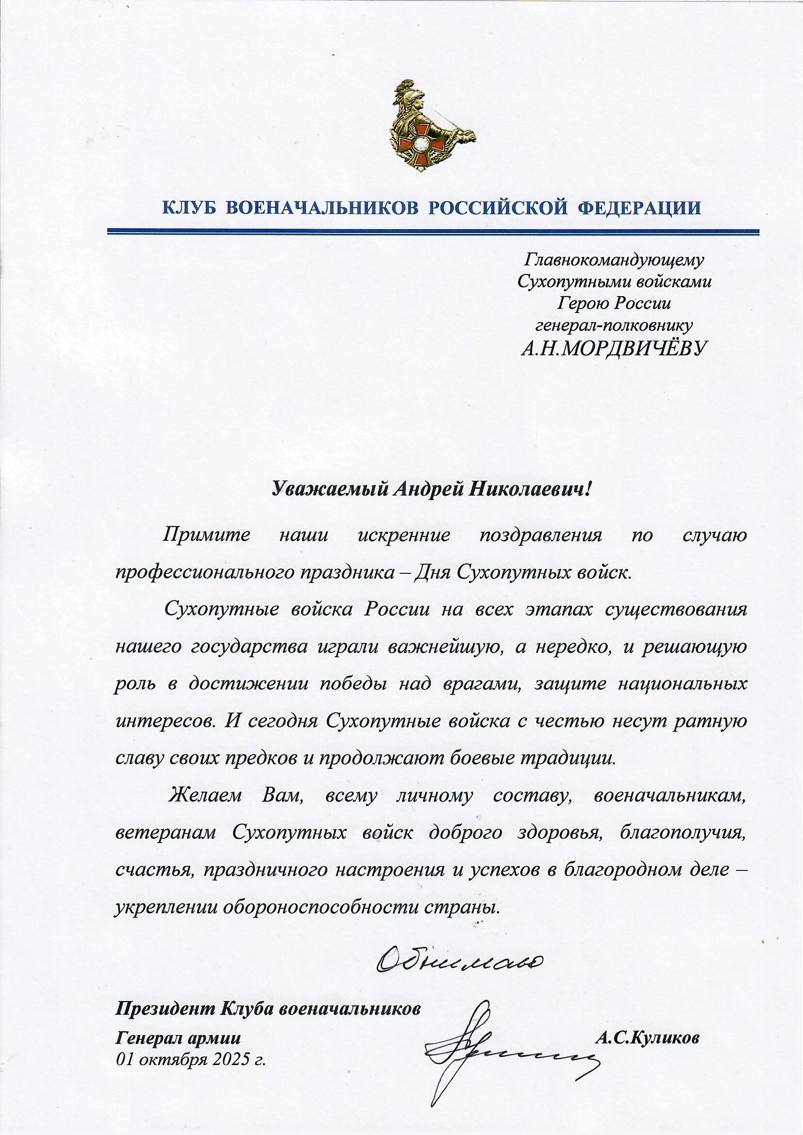 Президенту Российской Федерации Верховному Главнокомандующему Вооруженными Силами РФ Почетному члену Клуба военачальников РФ В.В. Путину
